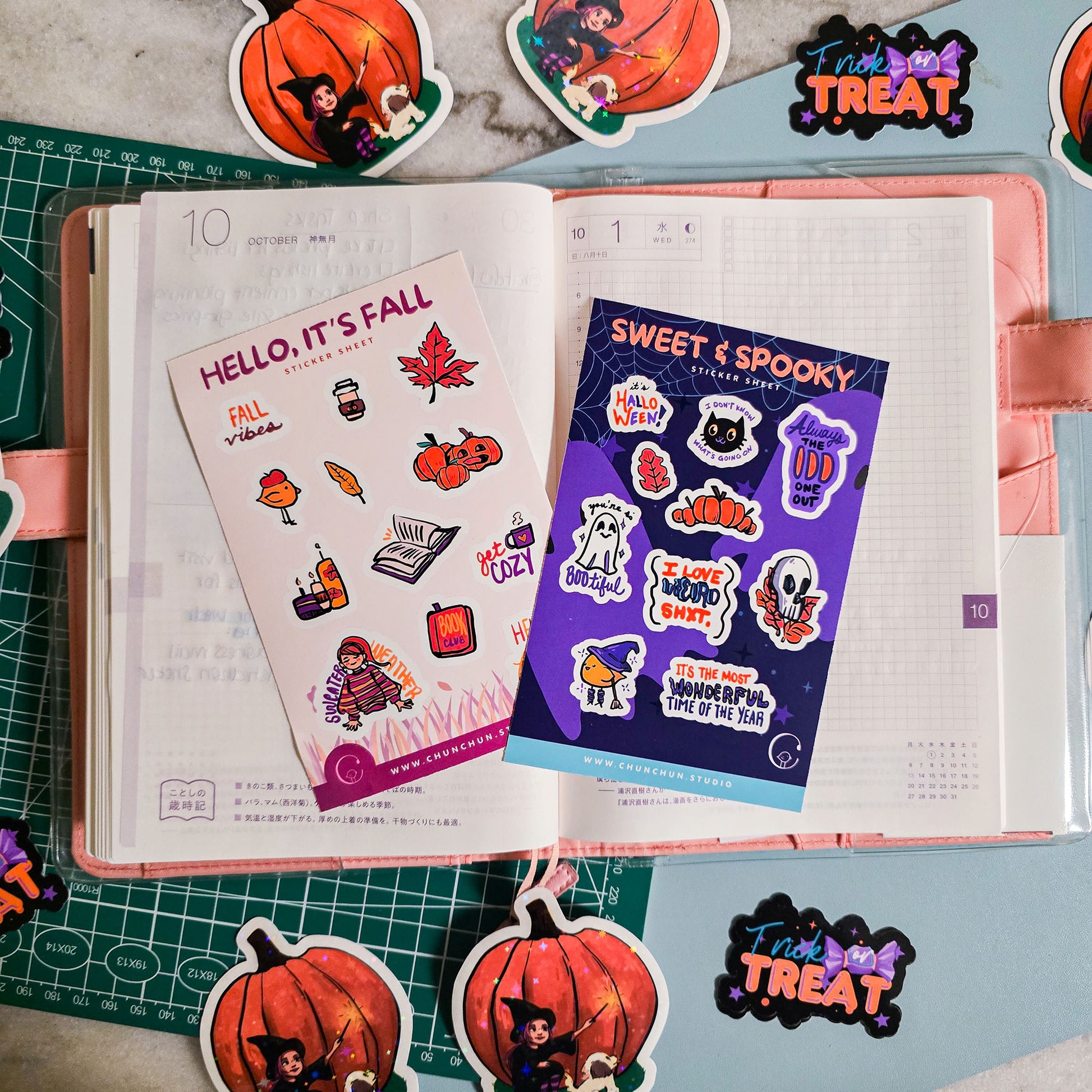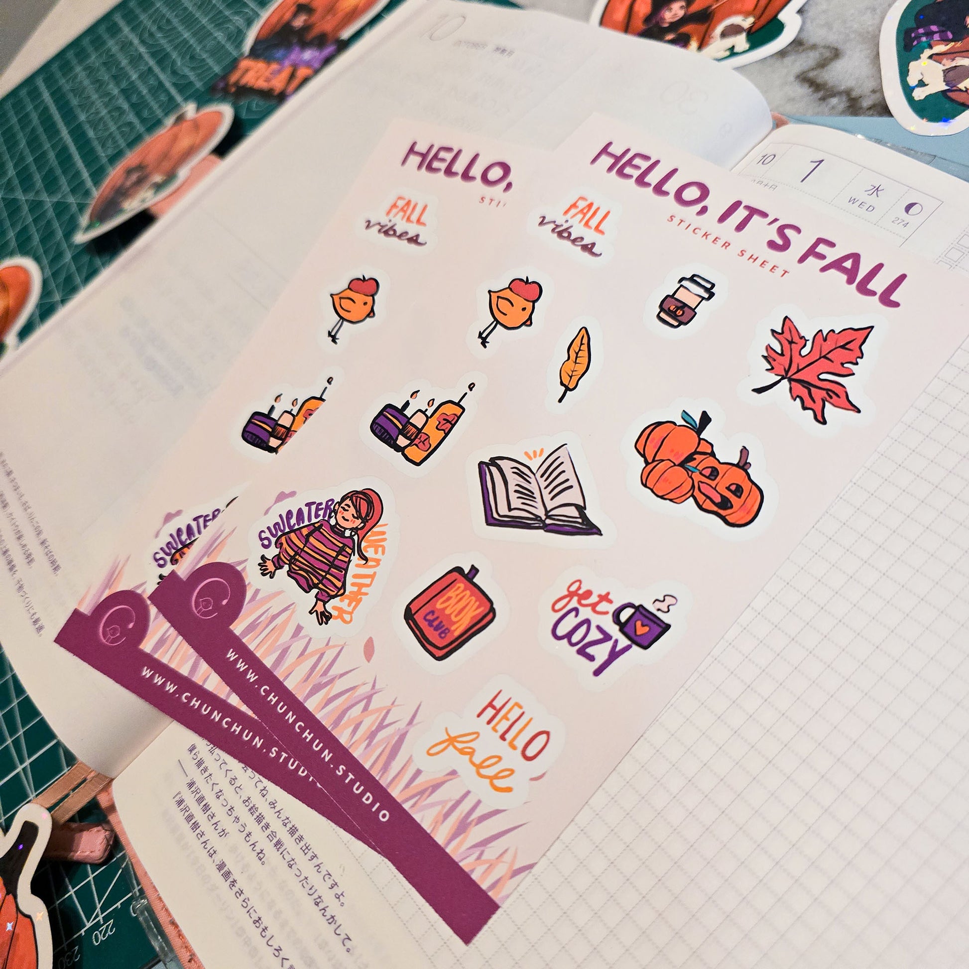 Celebrate cozy vibes with the Hello Fall sticker sheet! This 4x6 matte sheet features 12 hand-drawn mini stickers full of pumpkins, leaves, cozy drinks, and all the little joys that make fall magical. Perfect for decorating planners, notebooks, laptops, or anywhere you want to sprinkle a touch of seasonal charm.